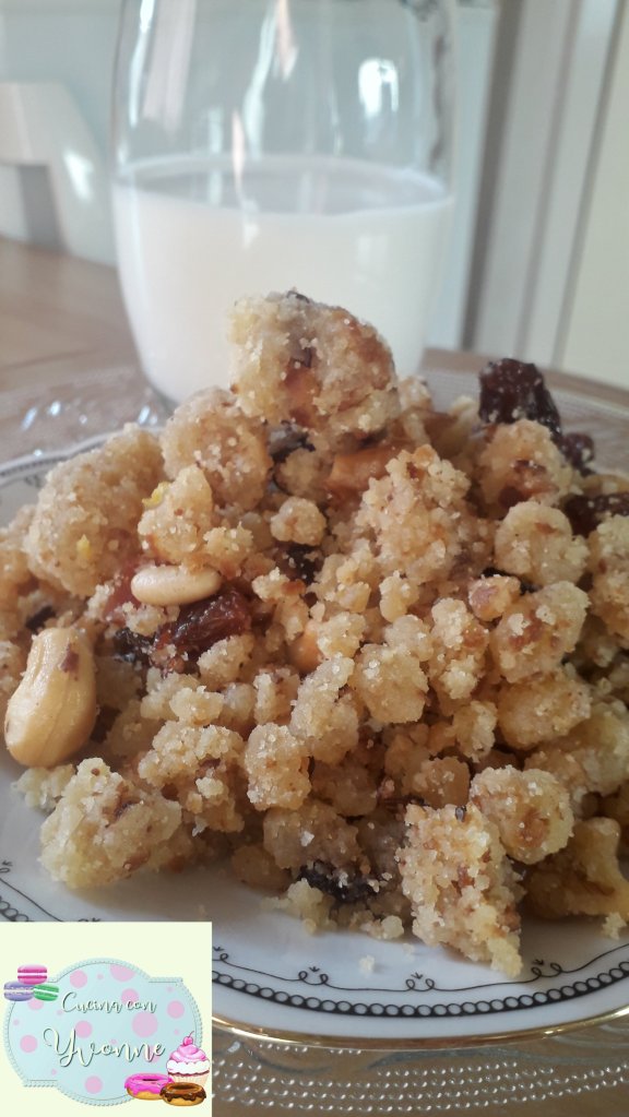È un dolce particolare ma vi assicuro che è molto buono alla fine avrà l’aspetto tipo di una granola, ottima per la colazione immersa nel latte freddo!