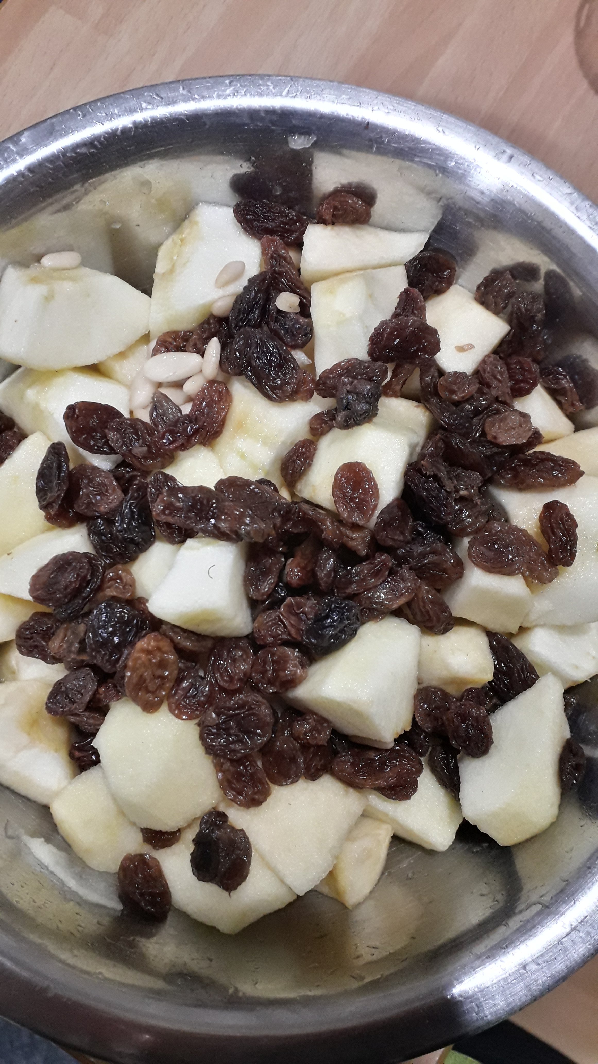 Nel frattempo mettete l’uvetta ammollo in acqua tiepida, una volta morbide strizziamole con le mani e mettiamole da parte , laviamo e sbucciamo le mele e tagliamole a pezzetti spruzzandole con il limone, tostiamo i pinoli in padella poi mettiamo tutto in una terrina con cannella e noci