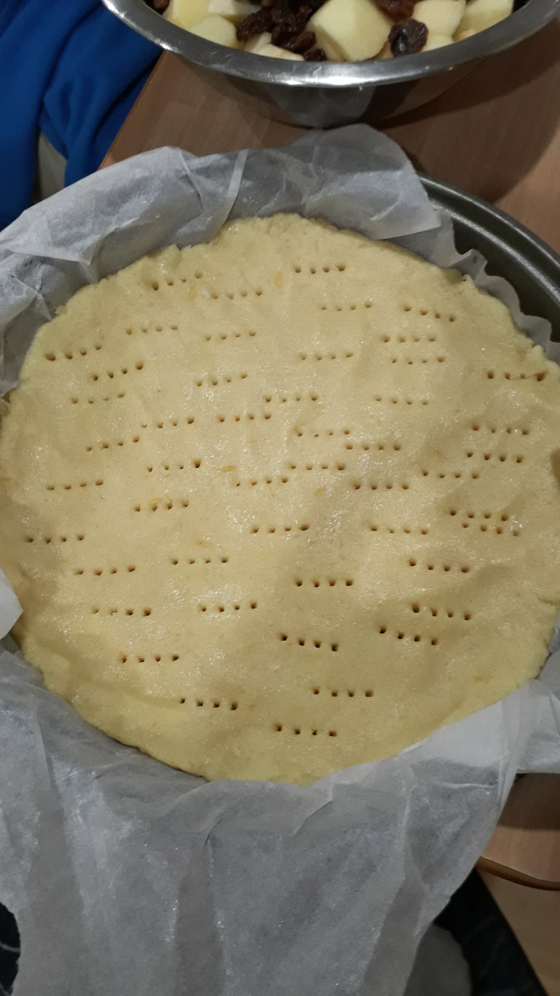 Prendiamo la nostra frolla e stendiamo poco più della metà foderiamo con carta forno una teglia da 22cm e bucherelliamo il fondo