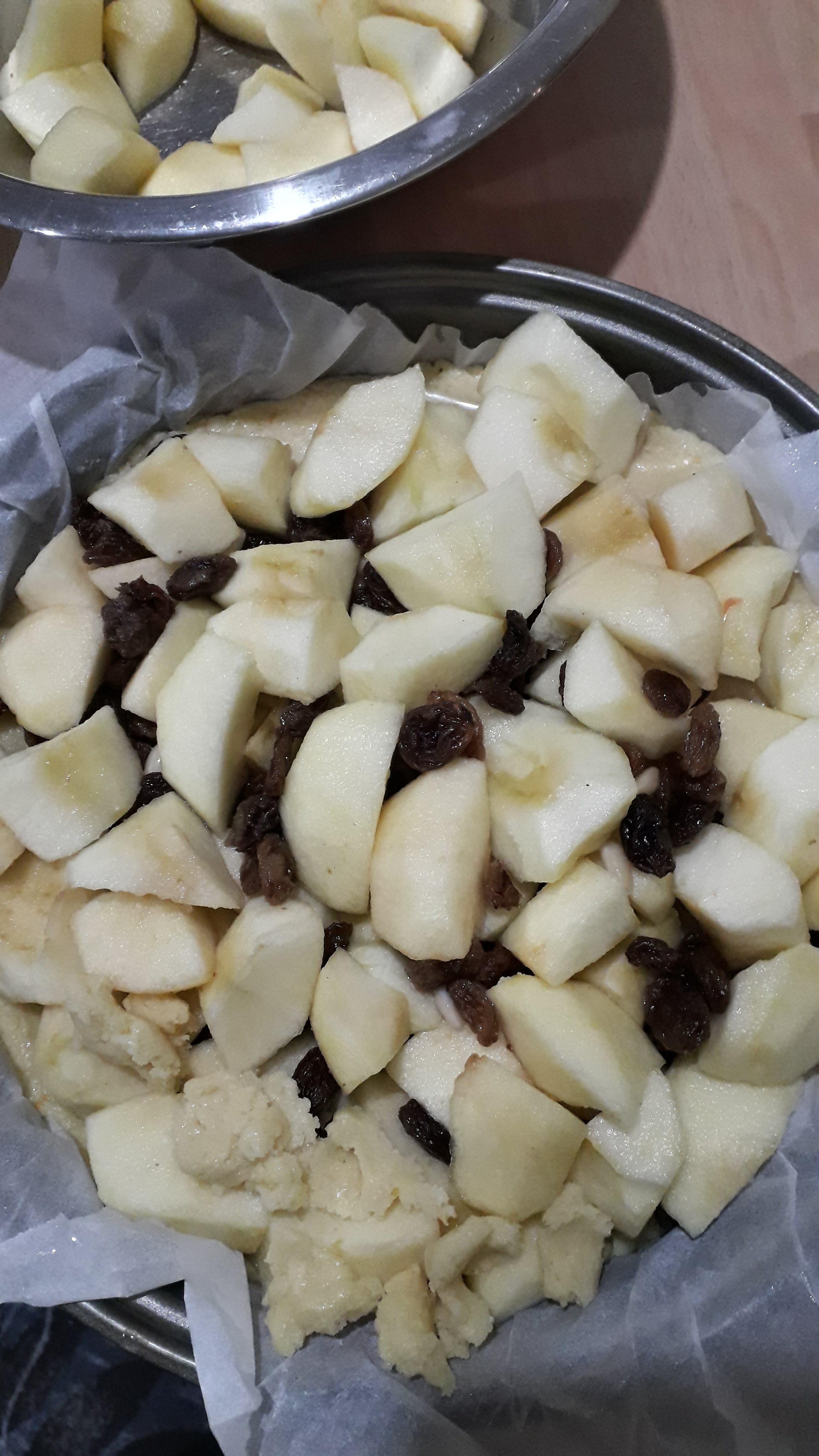 Una volta che la frolla sarà pronta chiudiamola con la pellicola e lasciamola riposare in frigo, nel frattempo mettete l’uvetta ammollo in acqua tiepida, laviamo e sbucciamo le mele e tagliamole a pezzetti spruzzandole con il limone poi tostiamo i pinoli in padella.
