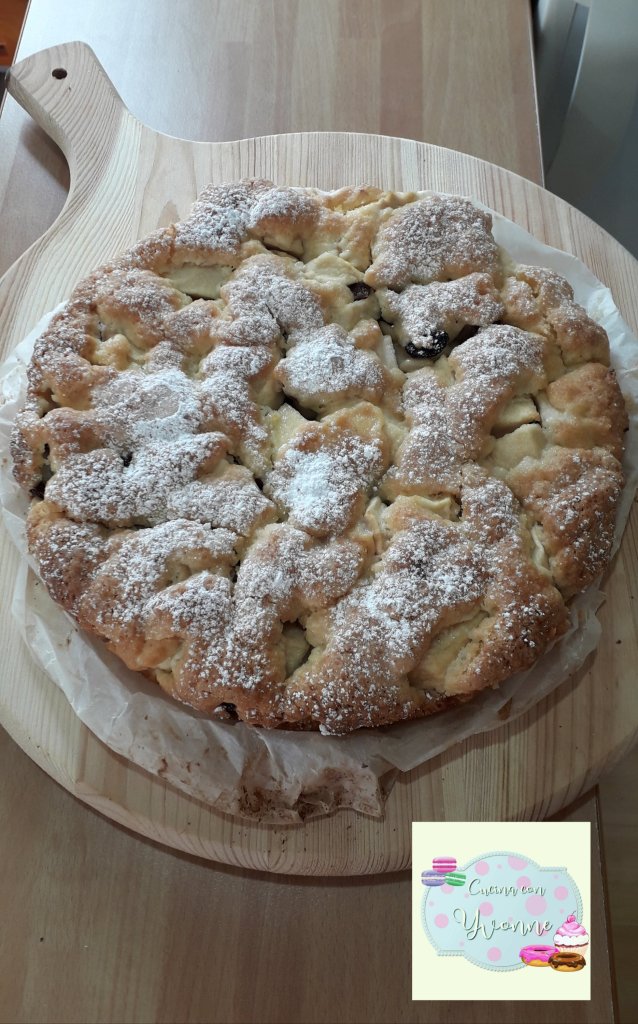 Una deliziosa frolla morbida al limone, con un ripieno di mele uvetta e pinoli, ottima con una buona tazza di thè o con della panna semi mortata con cannella, in compagnia di vecchie amiche per sparlare un pò di cose futili con ii bimbi che corrono in giardino, va beh mi sono fatta prendere dalla nostalgia della normalita di un tempo che sicuramemte tornera ,
