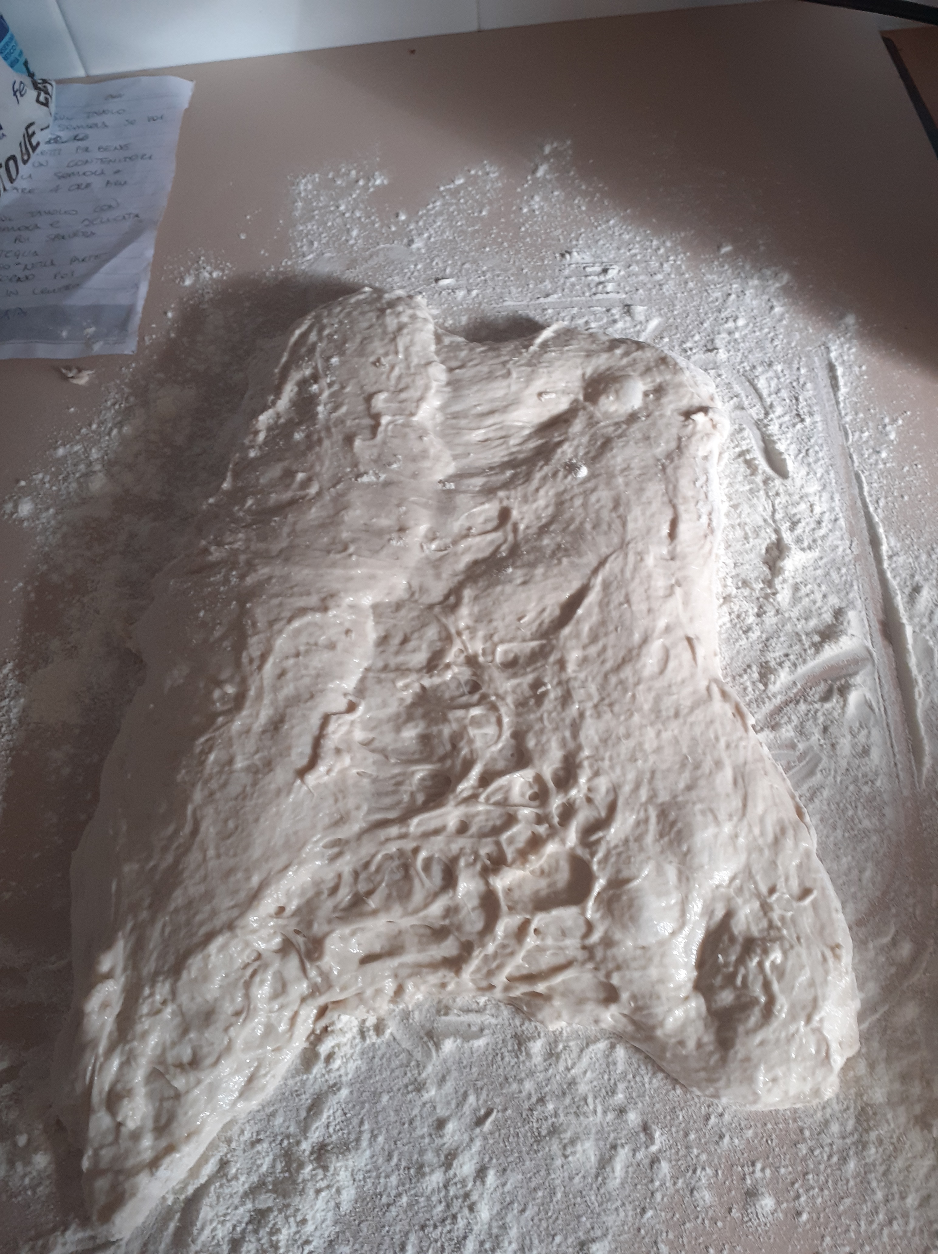 Dopo 1 ora spolveriamo il tavolo con un po di farina e versiamoci l’impasto allargandolo un pochino