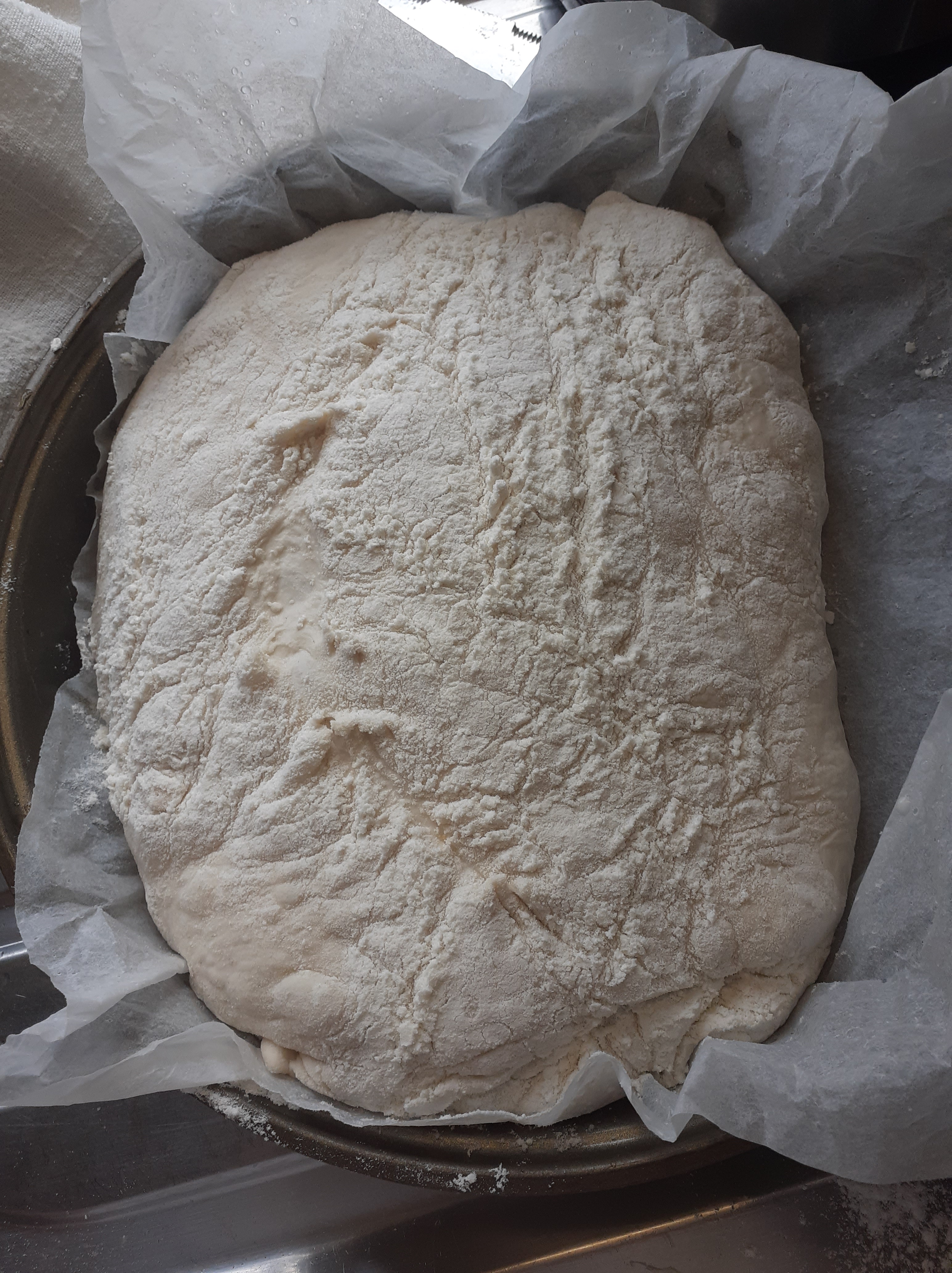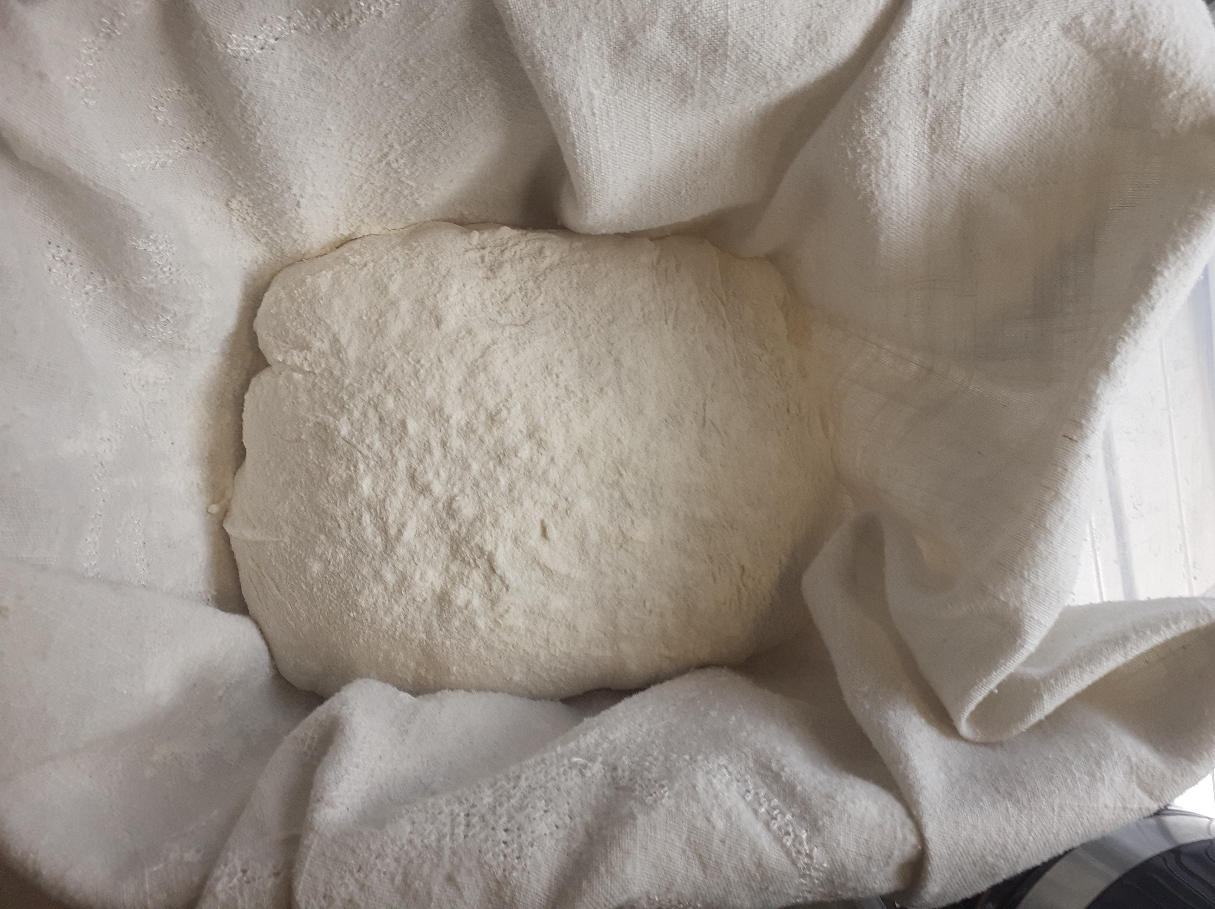 Mettiamo un canovaccio pulito e infarinato nel contenitore poi adagiamo il nostro panetto con l’apertura in basso e infariniamo la superficie, lasciamolo riposare per un altra oretta coperto