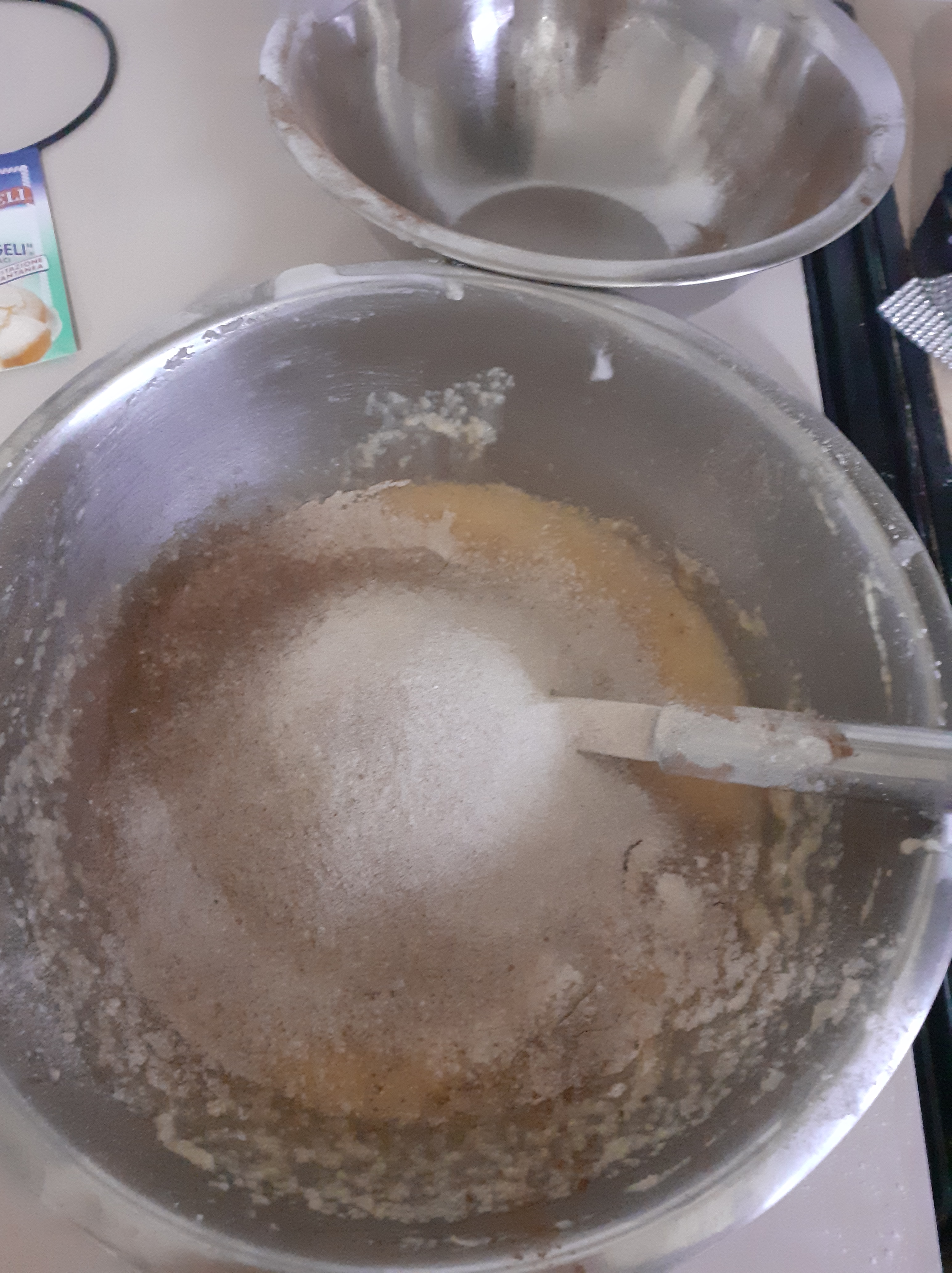 Dopodiché aggiungiamo la farina il cacao e il lievito setacciati mescoliamo bene possiamo aiutarci con le fruste elettriche