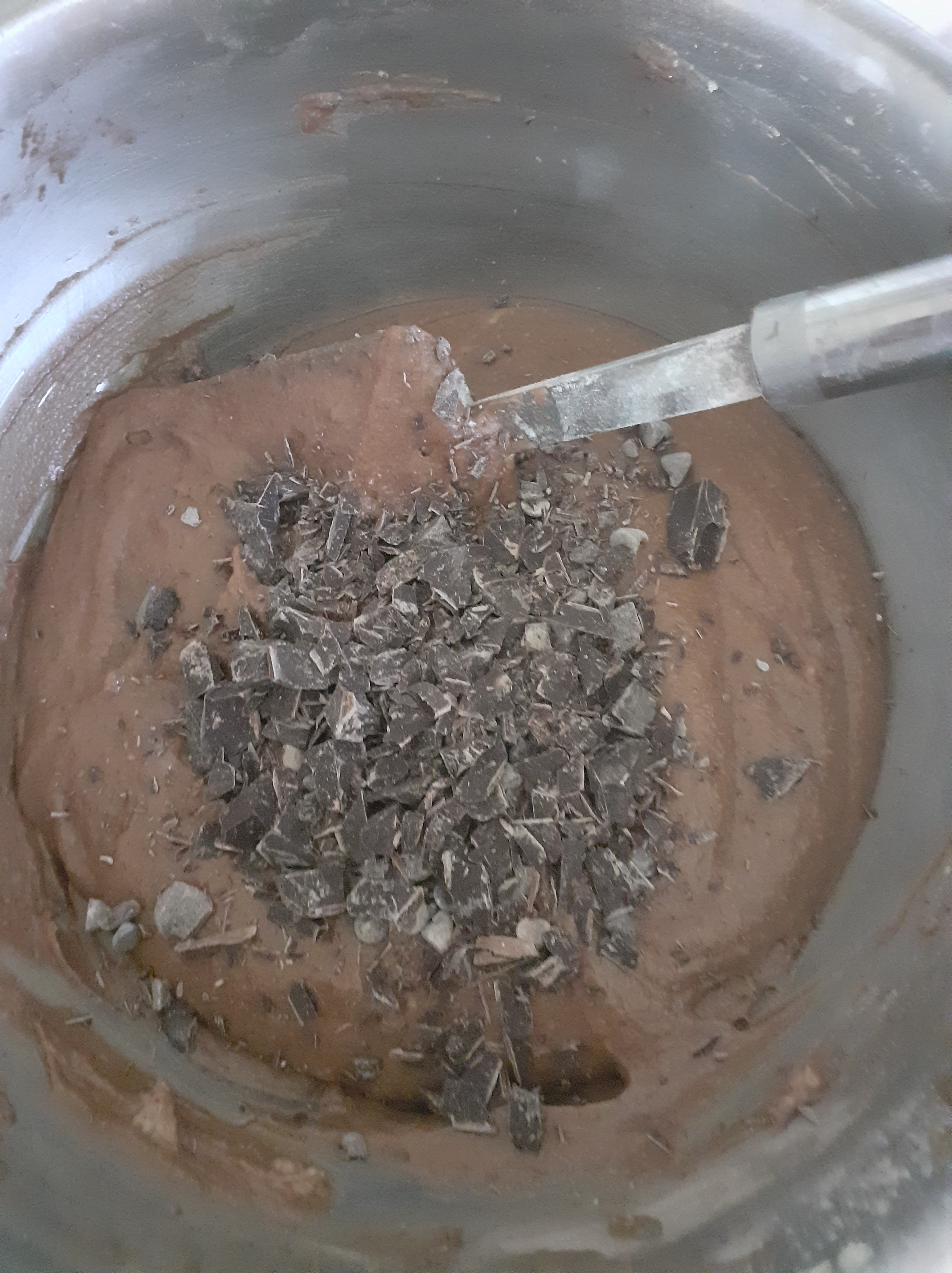 In fine aggiungiamo le gocce di cioccolato lasciando da parte una manciata per guarnire la superficie