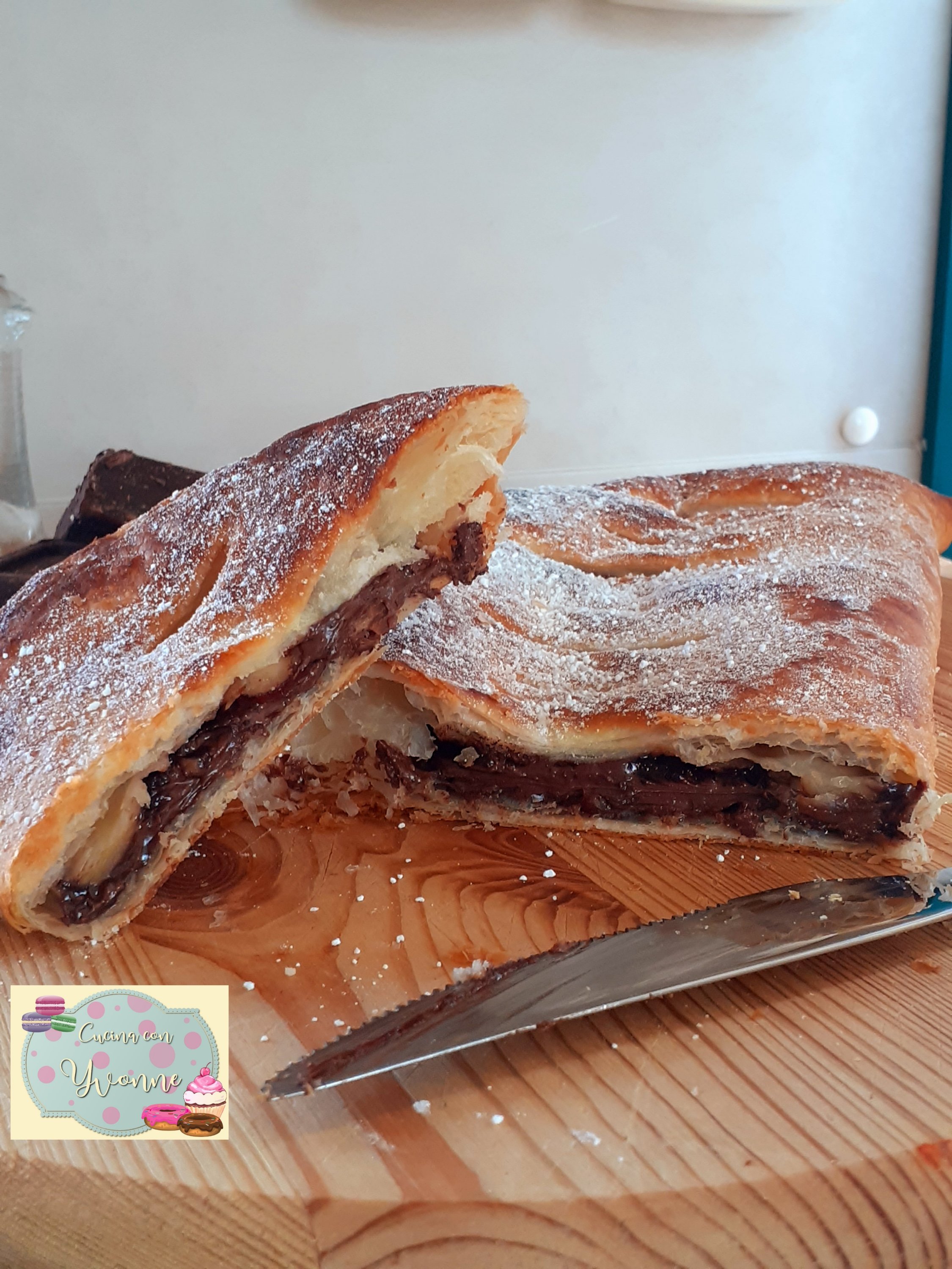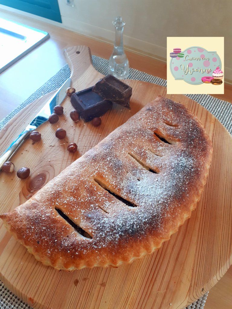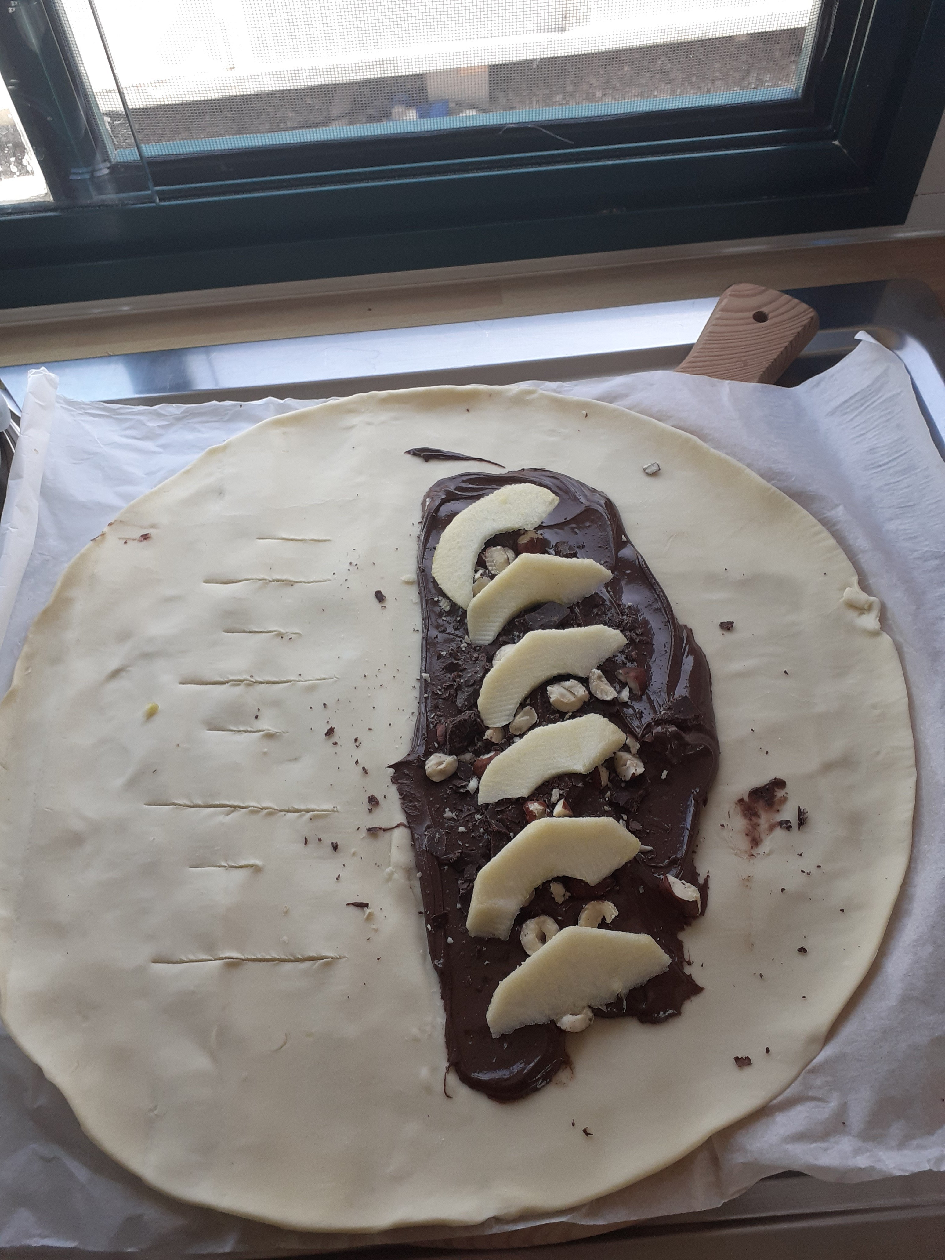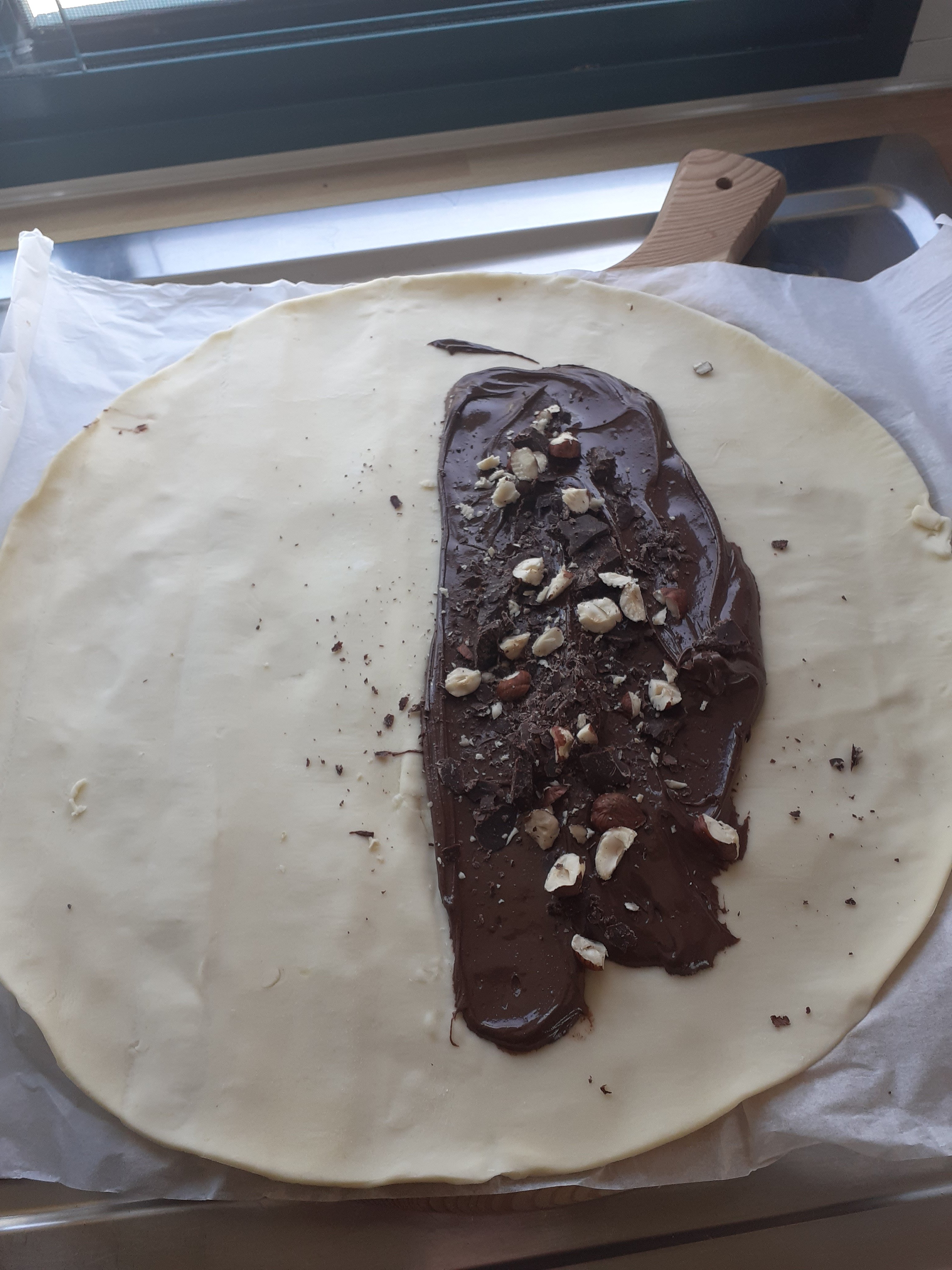 Srotoliamo la sfoglia e mettiamo su una metà di sfoglia 3/4 cucchiai di Nutella poi tritiamo grossolanamente le nocciole con il cioccolato fondente e cospargiamo sulla Nutella